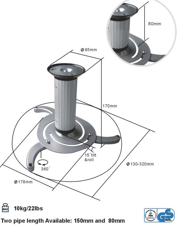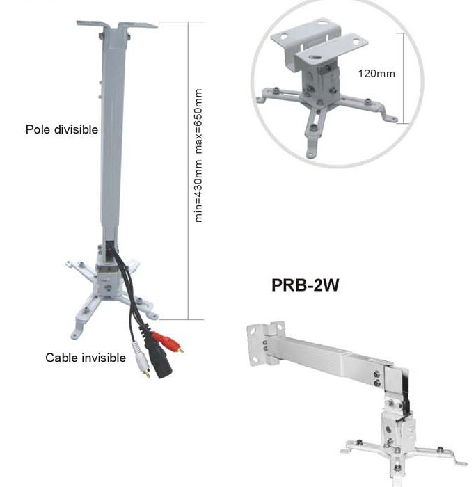 PRB-10 Projektoriteline kattokiinnitykseen Tilt:-20°~+20°, Kääntö:360° Katosta projetktoriin:575mm~825mm Kaapelien läpivienti Maksimi kuorma:20kgs
